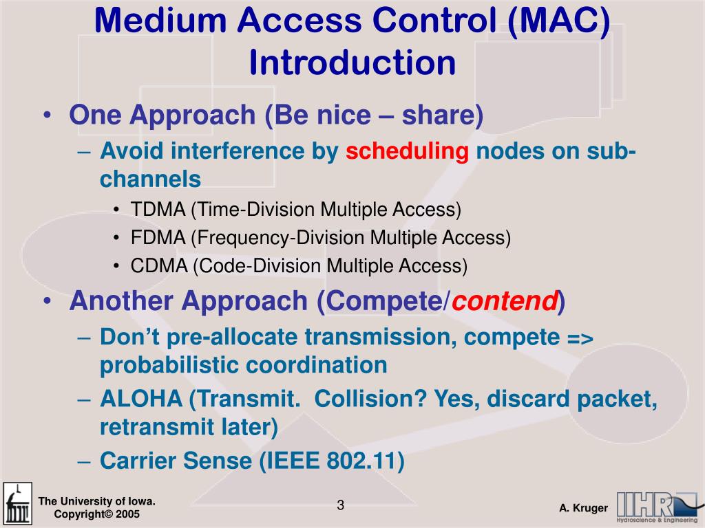 Introduction to Wireless Sensor Networks. Medium Access Control (MAC) 17 February 2005. Organizational. Class Website. www.engineering.uiowa.edu/~ece195/2005/. Class Time. Office Hours. Medium Access Control (MAC) Introduction. One Approach (Be nice – share)