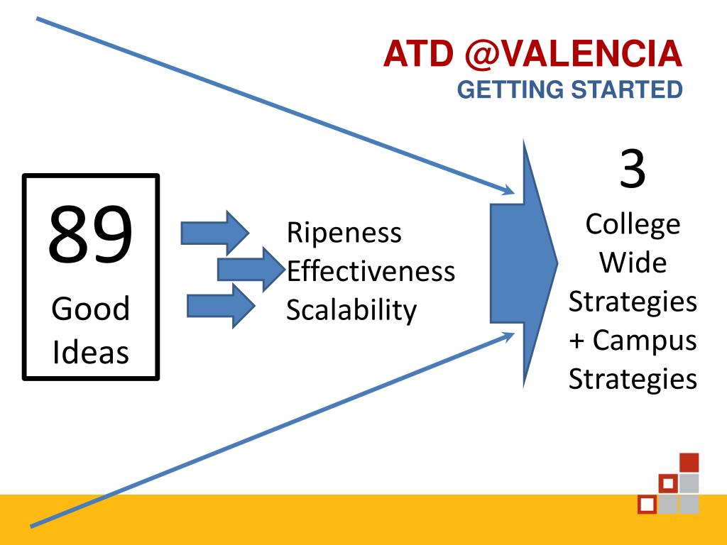 AtD @ValenciaGetting Started 3 College Wide Strategies + Campus Strategies 89 Good Ideas Ripeness Effectiveness Scalability