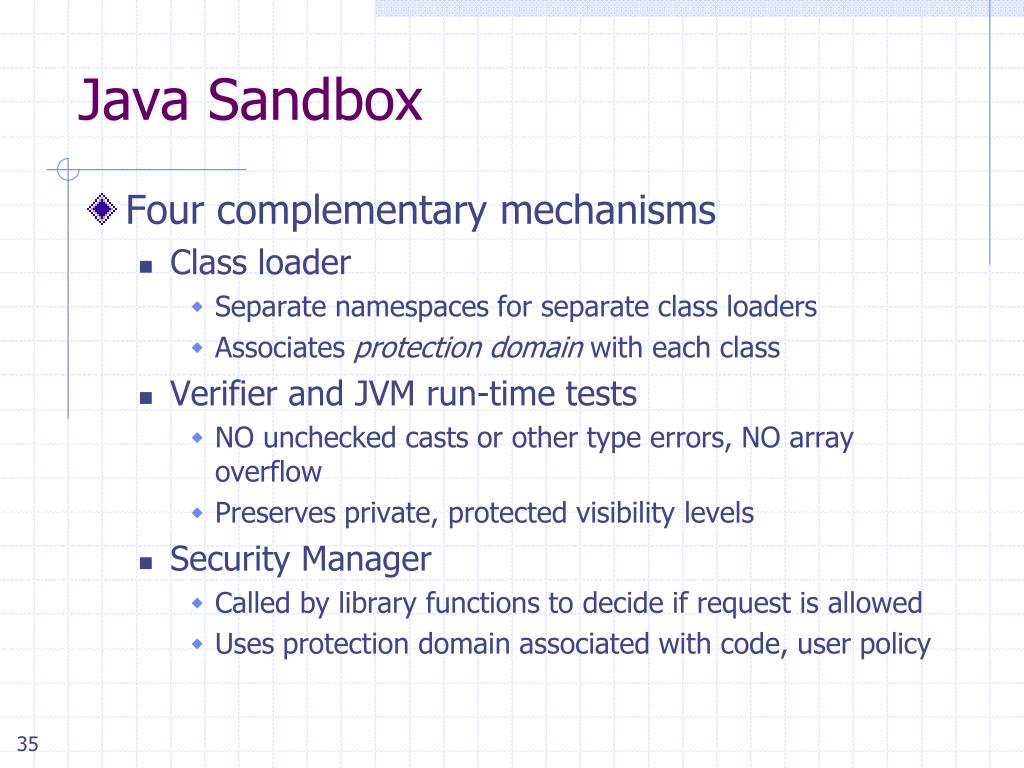 Java Sandbox • Four complementary mechanisms • Class loader • Separate namespaces for separate class loaders • Associates protection domain with each class • Verifier and JVM run-time tests • NO unchecked casts or other type errors, NO array overflow • Preserves private, protected visibility levels • Security Manager • Called by library functions to decide if request is allowed • Uses protection domain associated with code, user policy
