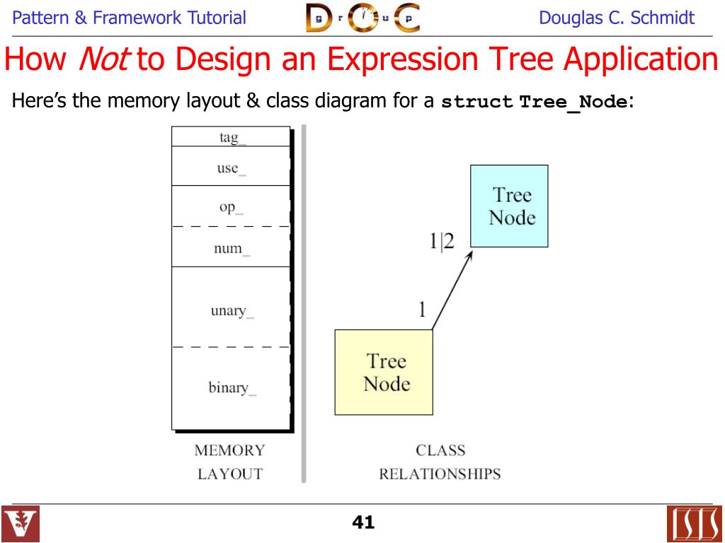 How Not to Design an Expression Tree Application A typical algorithmic-based solution for implementing expression trees uses a C struct/union to represent the main data structure typedefstructTree_Node { enum { NUM, UNARY, BINARY } tag_; short use_; /* reference count */ union { char op_[2]; int num_; } o; #define num_ o.num_ #define op_ o.op_ union { structTree_Node *unary_; struct { structTree_Node *l_, *r_;} binary_; } c; #define unary_ c.unary_ #define binary_ c.binary_ } Tree_Node;