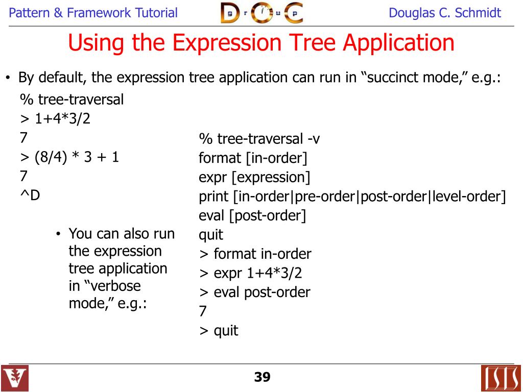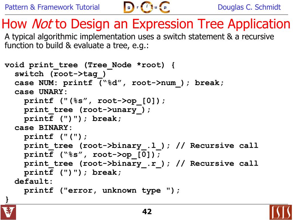 How Not to Design an Expression Tree Application A typical algorithmic implementation uses a switch statement & a recursive function to build & evaluate a tree, e.g.: void print_tree (Tree_Node *root) { switch (root->tag_) case NUM: printf (“%d”, root->num_); break; case UNARY: printf ("(%s”, root->op_[0]); print_tree (root->unary_); printf (")"); break; case BINARY: printf ("("); print_tree (root->binary_.l_); // Recursive call printf (“%s”, root->op_[0]); print_tree (root->binary_.r_); // Recursive call printf (")"); break; default: printf ("error, unknown type "); }