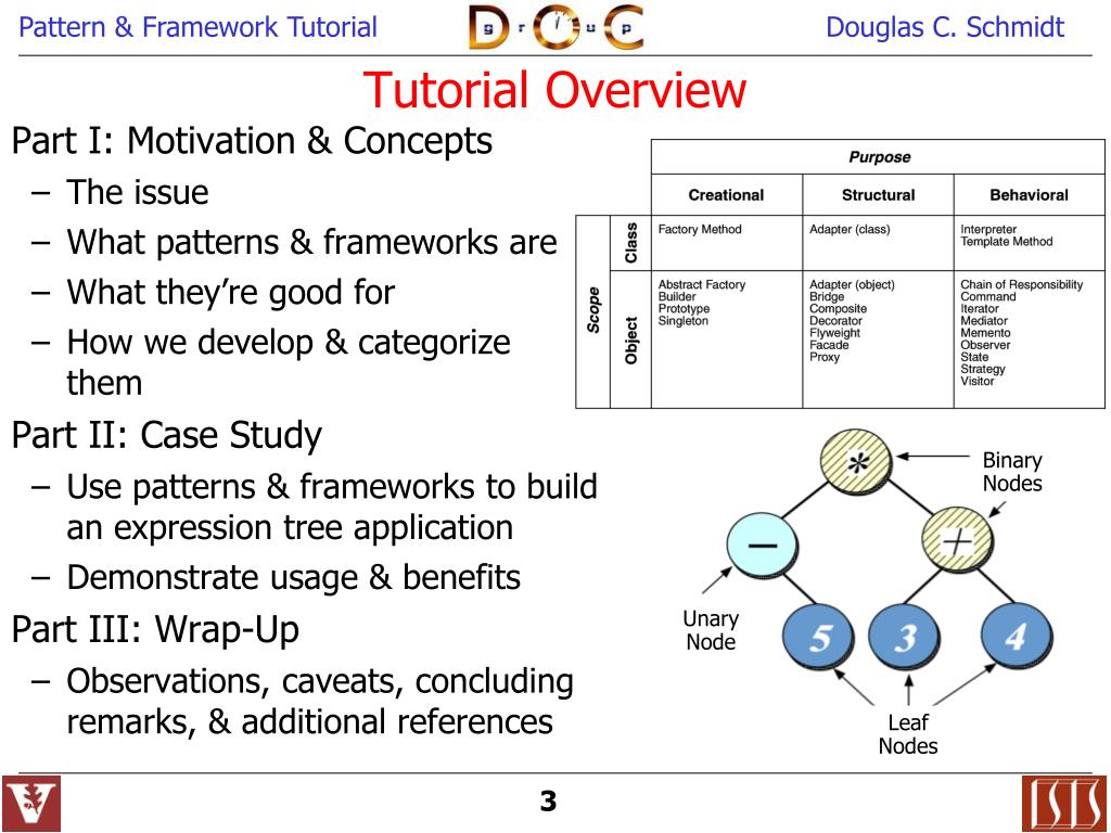 Tutorial Overview Part I: Motivation & Concepts • The issue • What patterns & frameworks are • What they’re good for • How we develop & categorize them Part II: Case Study • Use patterns & frameworks to build an expression tree application • Demonstrate usage & benefits Part III: Wrap-Up • Observations, caveats, concluding remarks, & additional references Binary Nodes Unary Node Leaf Nodes