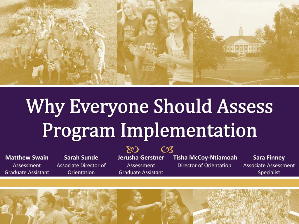 Why Everyone Should Assess Program Implementation. Matthew Swain. Sarah Sunde. Tisha McCoy-Ntiamoah. Sara Finney. Jerusha Gerstner. Assessment Graduate Assistant. Associate Director of Orientation. Assessment Graduate Assistant. Director of Orientation. Associate Assessment Specialist.