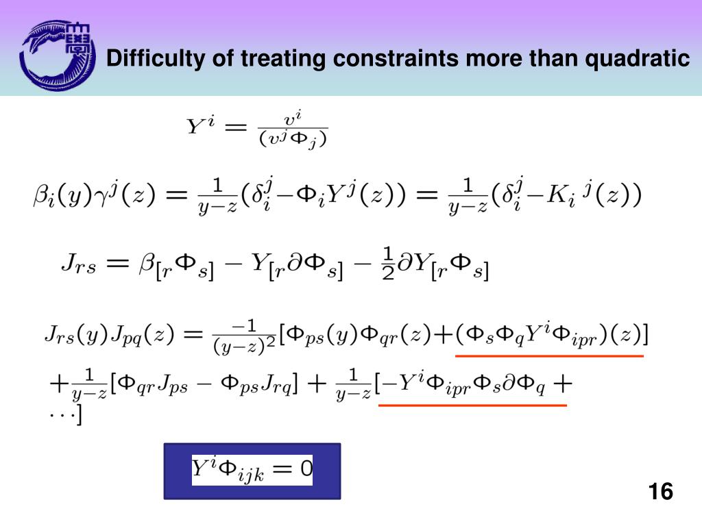 Conclusion • Construction of Y-formalism on a given hypersurface • Derivation of algebra among currents • Construction of quantum b-ghost • Calculation of partition function • Construction of Y-formalism on a given super-hypersurface A remaining question: How to treat systems with non-quadratic constraints?