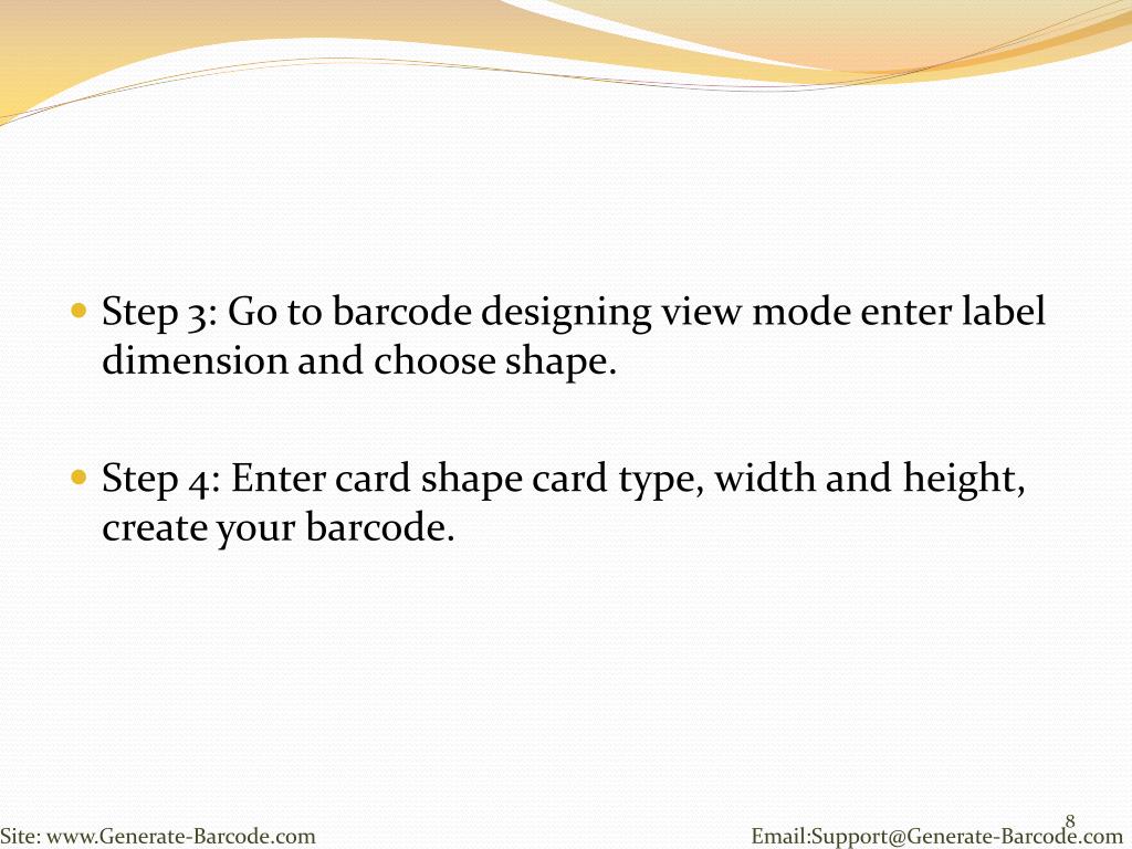 Step 3: Go to barcode designing view mode enter label dimension and choose shape. • Step 4: Enter card shape card type, width and height, create your barcode. Site: www.Generate-Barcode.com Email:Support@Generate-Barcode.com