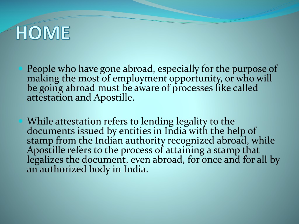 HOME • People who have gone abroad, especially for the purpose of making the most of employment opportunity, or who will be going abroad must be aware of processes like called attestation and Apostille. • While attestation refers to lending legality to the documents issued by entities in India with the help of stamp from the Indian authority recognized abroad, while Apostille refers to the process of attaining a stamp that legalizes the document, even abroad, for once and for all by an authorized body in India.