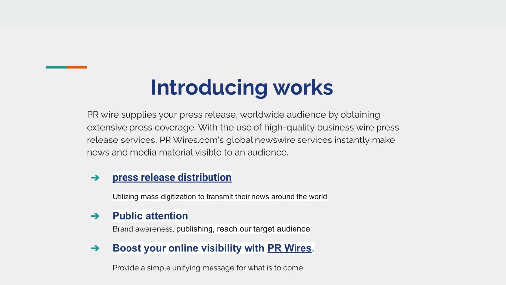 Introducing works PR wire supplies your press release, worldwide audience by obtaining extensive press coverage. With the use of high-quality business wire press release services, PR Wires.com's global newswire services instantly make news and media material visible to an audience. press release distribution ➔ ➔ Utilizing mass digitization to transmit their news around the world Public attention Brand awareness, publishing, reach our target audience ➔ ➔ Boost your online visibility with PR Wires. ➔ ➔ Provide a simple unifying message for what is to come