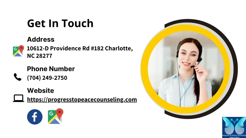 Get In Touch Address 10612-D Providence Rd #182 Charlotte, NC 28277 Phone Number (704) 249-2750 Website https://progresstopeacecounseling.com