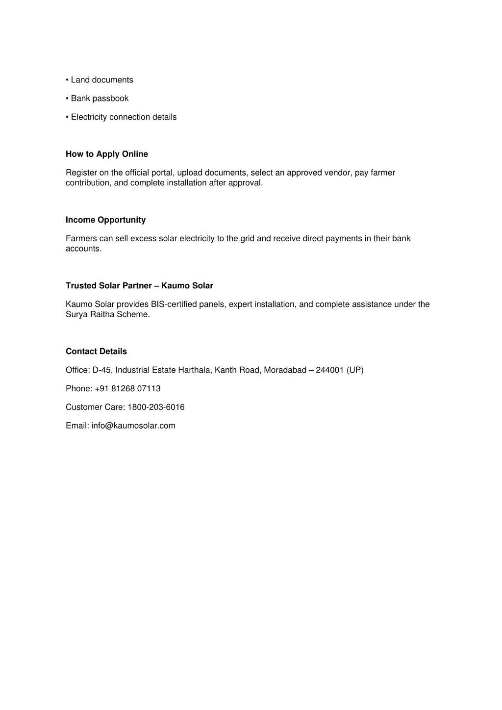 • Land documents • Bank passbook • Electricity connection details How to Apply Online Register on the official portal, upload documents, select an approved vendor, pay farmer contribution, and complete installation after approval. Income Opportunity Farmers can sell excess solar electricity to the grid and receive direct payments in their bank accounts. Trusted Solar Partner – Kaumo Solar Kaumo Solar provides BIS-certified panels, expert installation, and complete assistance under the Surya Raitha Scheme. Contact Details Office: D-45, Industrial Estate Harthala, Kanth Road, Moradabad – 244001 (UP) Phone: +91 81268 07113 Customer Care: 1800-203-6016 Email: info@kaumosolar.com