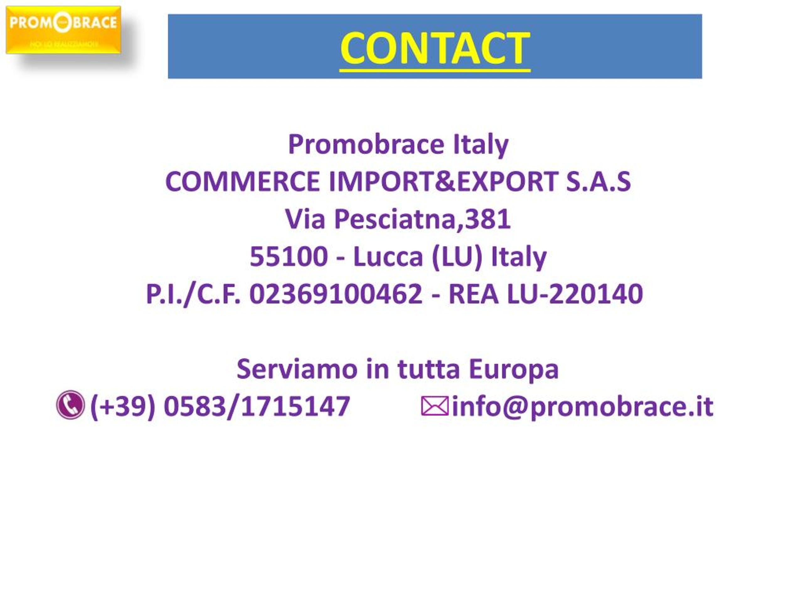 Promobrace ItalyCOMMERCE IMPORT&EXPORT S.A.SVia Pesciatna,38155100 - Lucca (LU) ItalyP.I./C.F. 02369100462 - REA LU-220140 Serviamo in tutta Europa (+39) 0583/1715147 info@promobrace.it