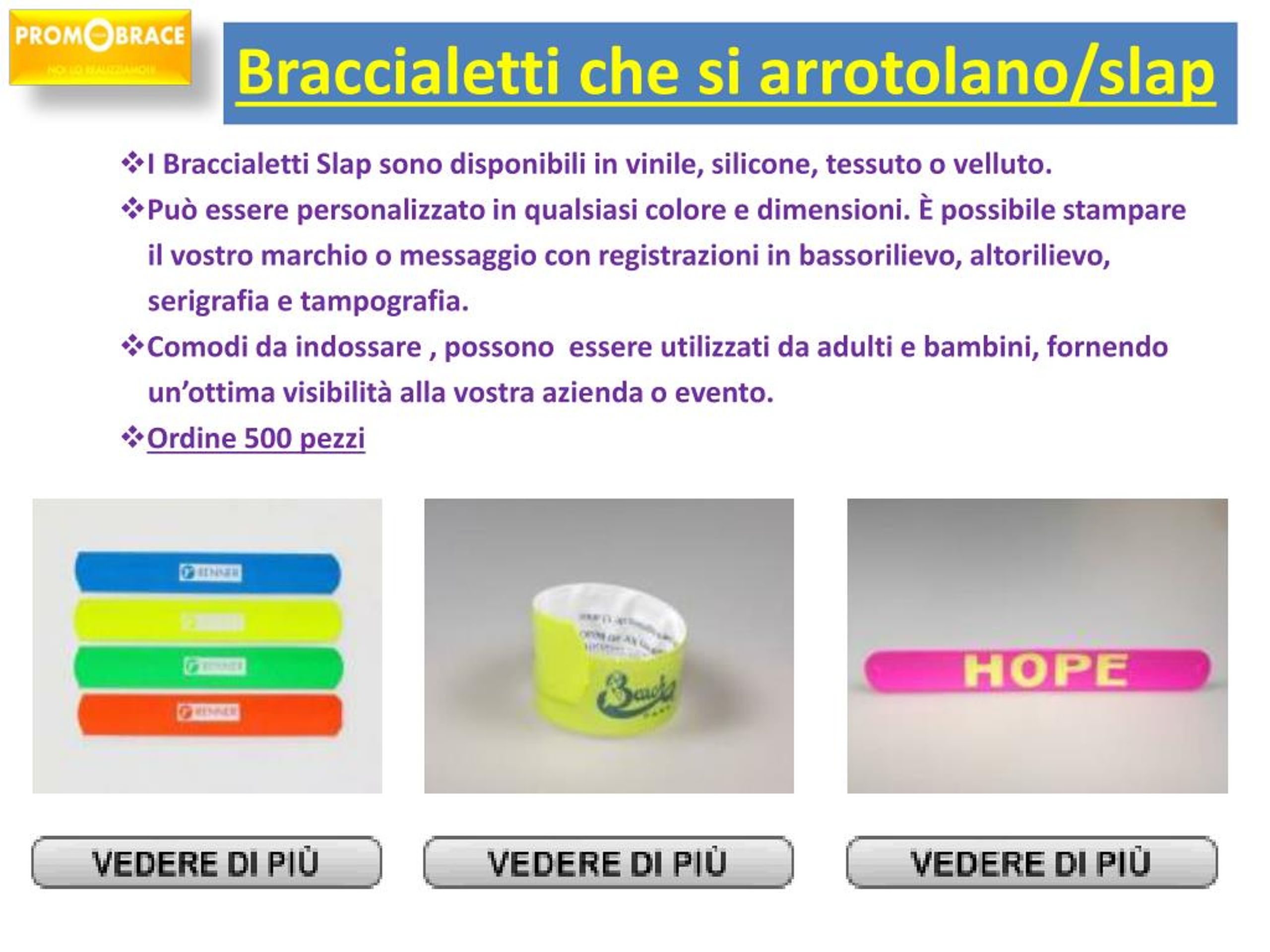 I Braccialetti Slap sono disponibili in vinile, silicone, tessuto o velluto. Può essere personalizzato in qualsiasi colore e dimensioni. È possibile stampare il vostro marchio o messaggio con registrazioni in bassorilievo, altorilievo, serigrafia e tampografia. Comodi da indossare , possono essere utilizzati da adulti e bambini, fornendo un’ottima visibilità alla vostra azienda o evento. Ordine 500 pezzi