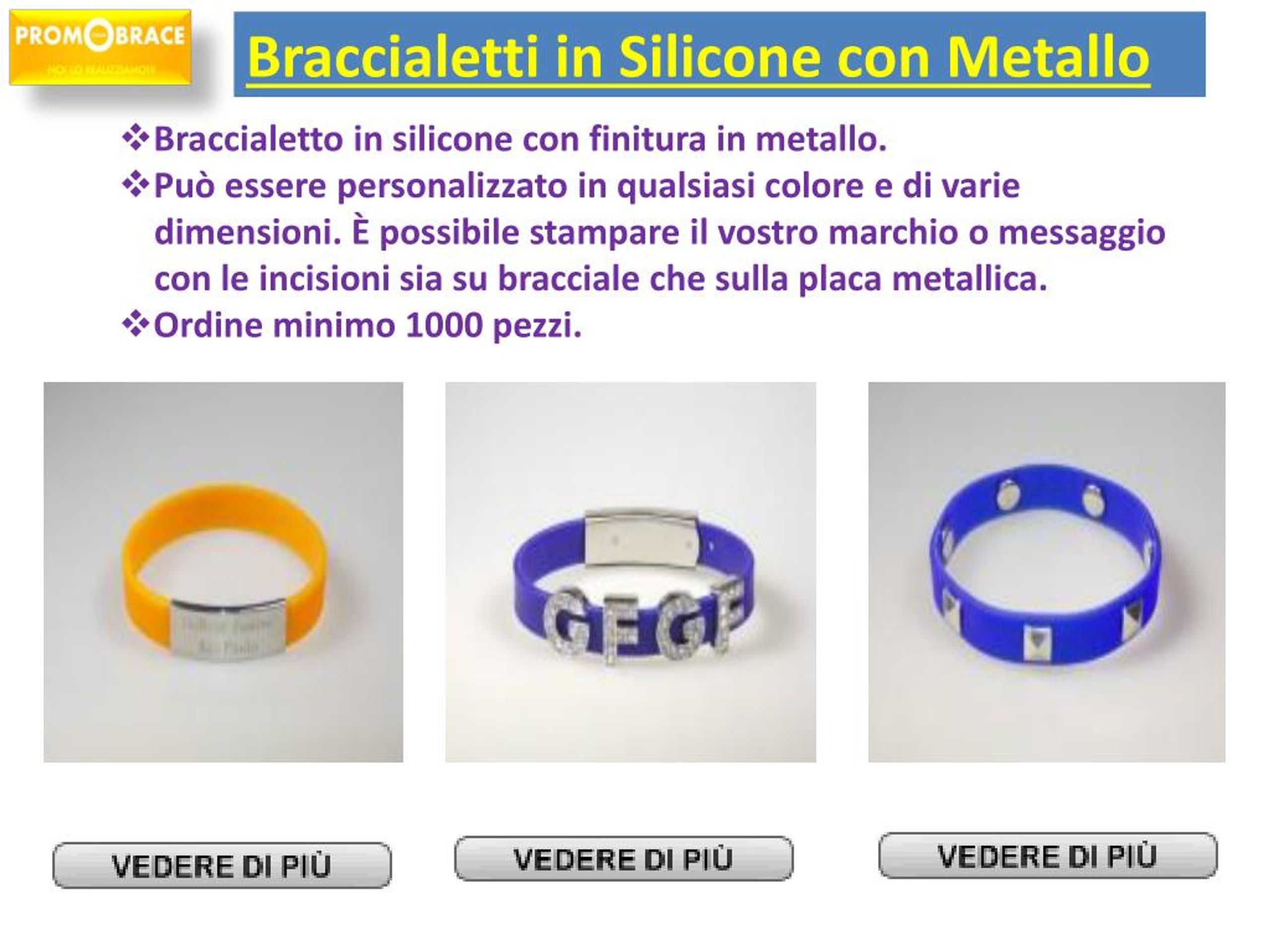 Braccialetto in silicone con finitura in metallo. Può essere personalizzato in qualsiasi colore e di varie dimensioni. È possibile stampare il vostro marchio o messaggio con le incisioni sia su bracciale che sulla placa metallica. Ordine minimo 1000 pezzi.