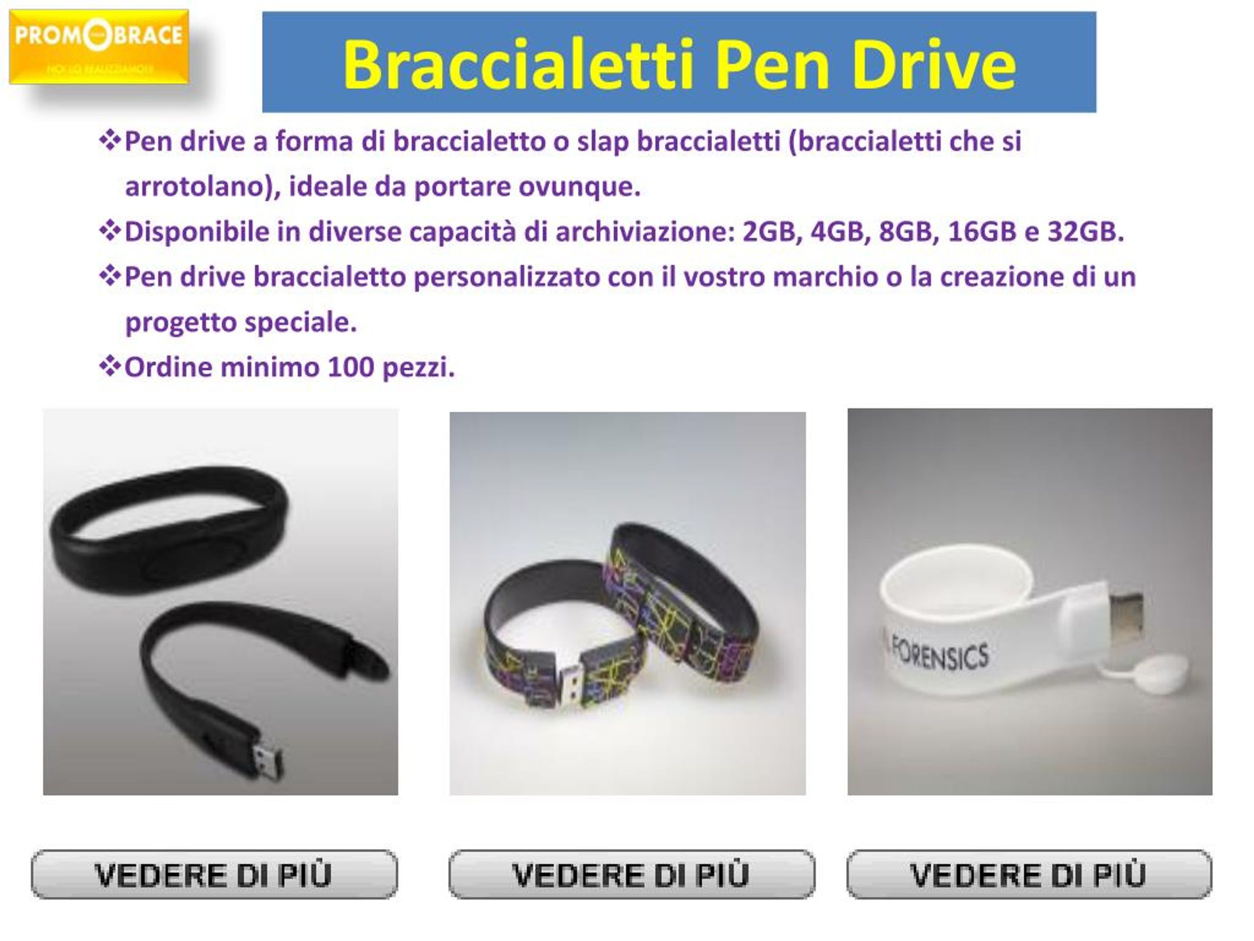 Pen drive a forma di braccialetto o slap braccialetti (braccialetti che si arrotolano), ideale da portare ovunque. Disponibile in diverse capacità di archiviazione: 2GB, 4GB, 8GB, 16GB e 32GB. Pen drive braccialetto personalizzato con il vostro marchio o la creazione di un progetto speciale. Ordine minimo 100 pezzi.