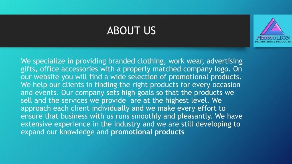 ABOUT US We specialize in providingbranded clothing, work wear, advertising gifts, office accessories with a properly matched company logo. On our website you will find a wide selection of promotional products. We help our clients in finding the right products for every occasion and events. Our company sets high goals so that the products we sell and the services we provide are at the highest level. We approach each client individually and we make every effort to ensure that business with us runs smoothly and pleasantly. We have extensive experience in the industry and we are still developing to expand our knowledge and promotionalproducts