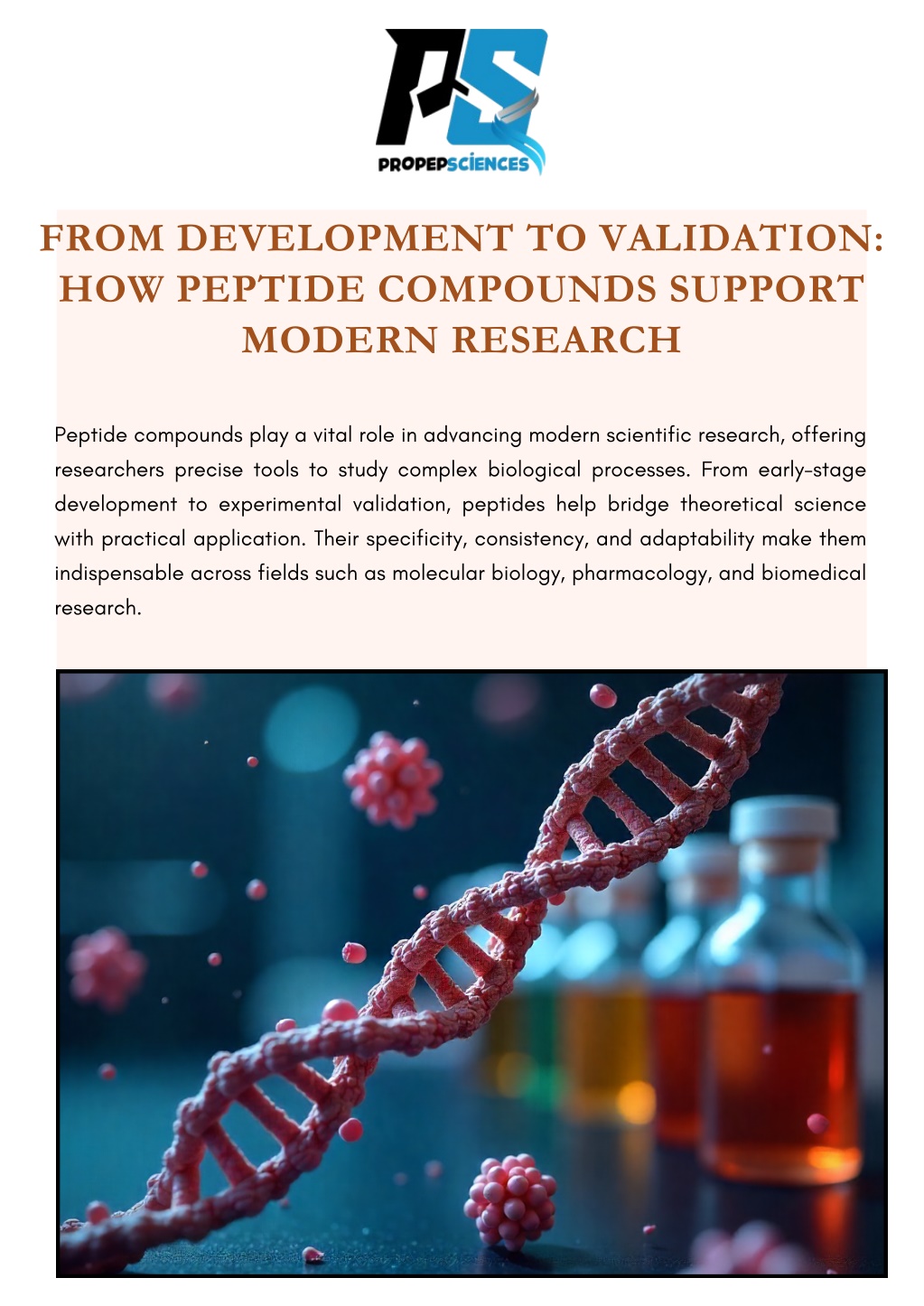 7. ROLE IN EXPERIMENTAL VALIDATION During validation phases, peptide compounds are used to confirm hypotheses and verify experimental models. Their predictable behavior enables researchers to compare outcomes, measure responses, and refine experimental parameters. Effective validation strengthens conclusions and supports the progression from exploratory research to applied science. 8. ENABLING DIVERSE RESEARCH APPLICATIONS Peptide compounds are highly adaptable, making them suitable for a broad range of research fields. From cellular signaling and receptor studies to metabolic and biochemical research, peptides can be customized to meet evolving scientific needs. Their flexibility ensures continued relevance as research technologies advance. CONCLUSION From initial concept and molecular design to rigorous validation and application, peptide compounds play a foundational role in modern research. Their precision, stability, and reliability support accurate experimentation and reproducible results. As scientific inquiry continues to expand, well-developed peptide compounds will remain essential tools for advancing knowledge, innovation, and research integrity. CONTACT NOW: www.propepsciences.com info@propepsciences.com United Kingdom