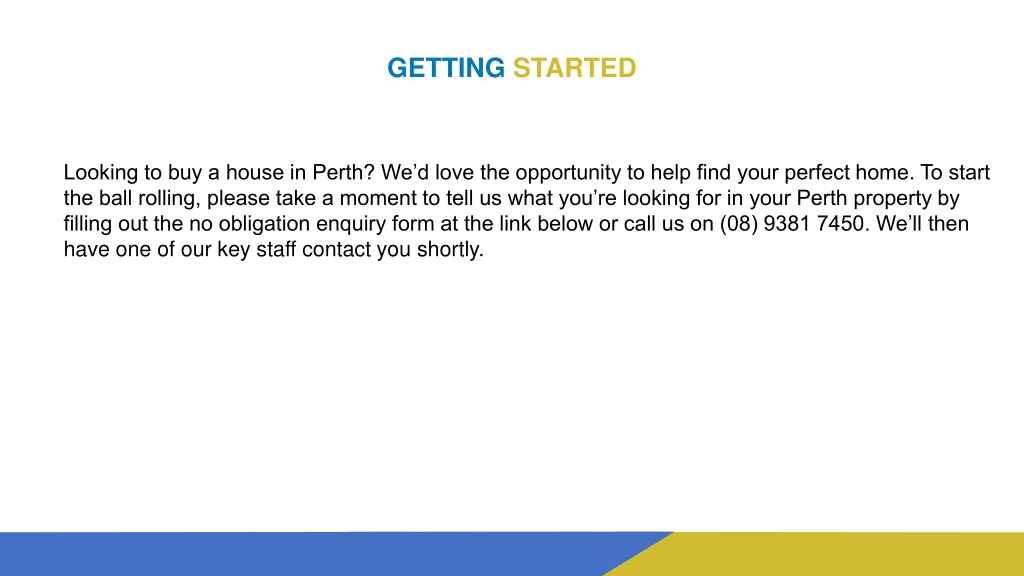 GETTING STARTED Looking to buy a house in Perth? We’d love the opportunity to help find your perfect home. To start the ball rolling, please take a moment to tell us what you’re looking for in your Perth property by filling out the no obligation enquiry form at the link below or call us on (08) 9381 7450. We’ll then have one of our key staff contact you shortly.