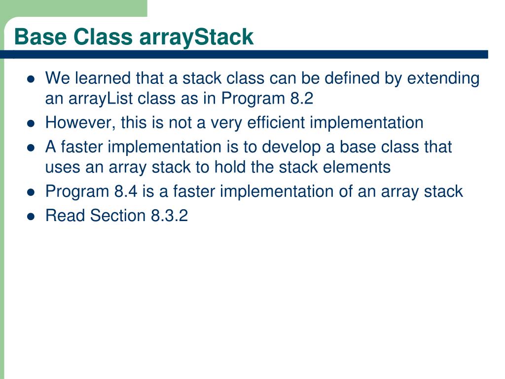 Base Class arrayStack • We learned that a stack class can be defined by extending an arrayList class as in Program 8.2 • However, this is not a very efficient implementation • A faster implementation is to develop a base class that uses an array stack to hold the stack elements • Program 8.4 is a faster implementation of an array stack • Read Section 8.3.2