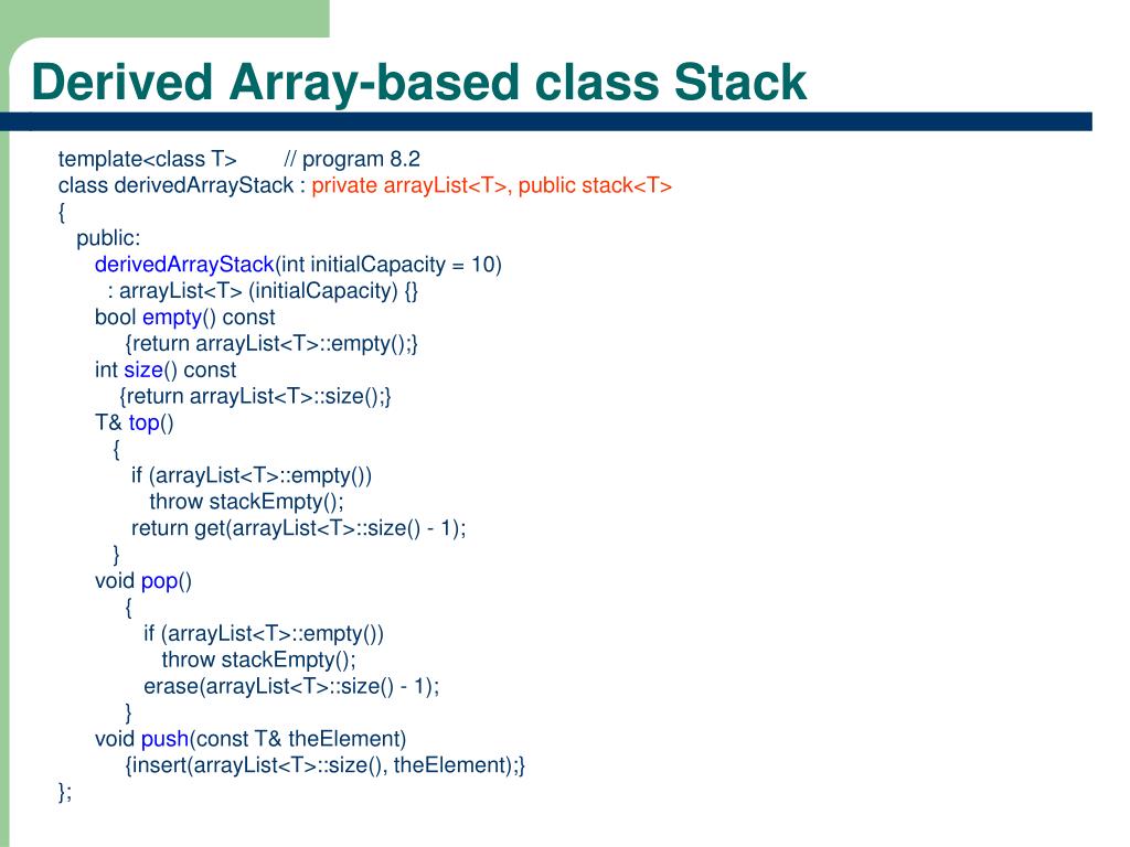 Derived Array-based class Stack template<class T> // program 8.2 class derivedArrayStack : private arrayList<T>, public stack<T> { public: derivedArrayStack(int initialCapacity = 10) : arrayList<T> (initialCapacity) {} bool empty() const {return arrayList<T>::empty();} int size() const {return arrayList<T>::size();} T& top() { if (arrayList<T>::empty()) throw stackEmpty(); return get(arrayList<T>::size() - 1); } void pop() { if (arrayList<T>::empty()) throw stackEmpty(); erase(arrayList<T>::size() - 1); } void push(const T& theElement) {insert(arrayList<T>::size(), theElement);} };