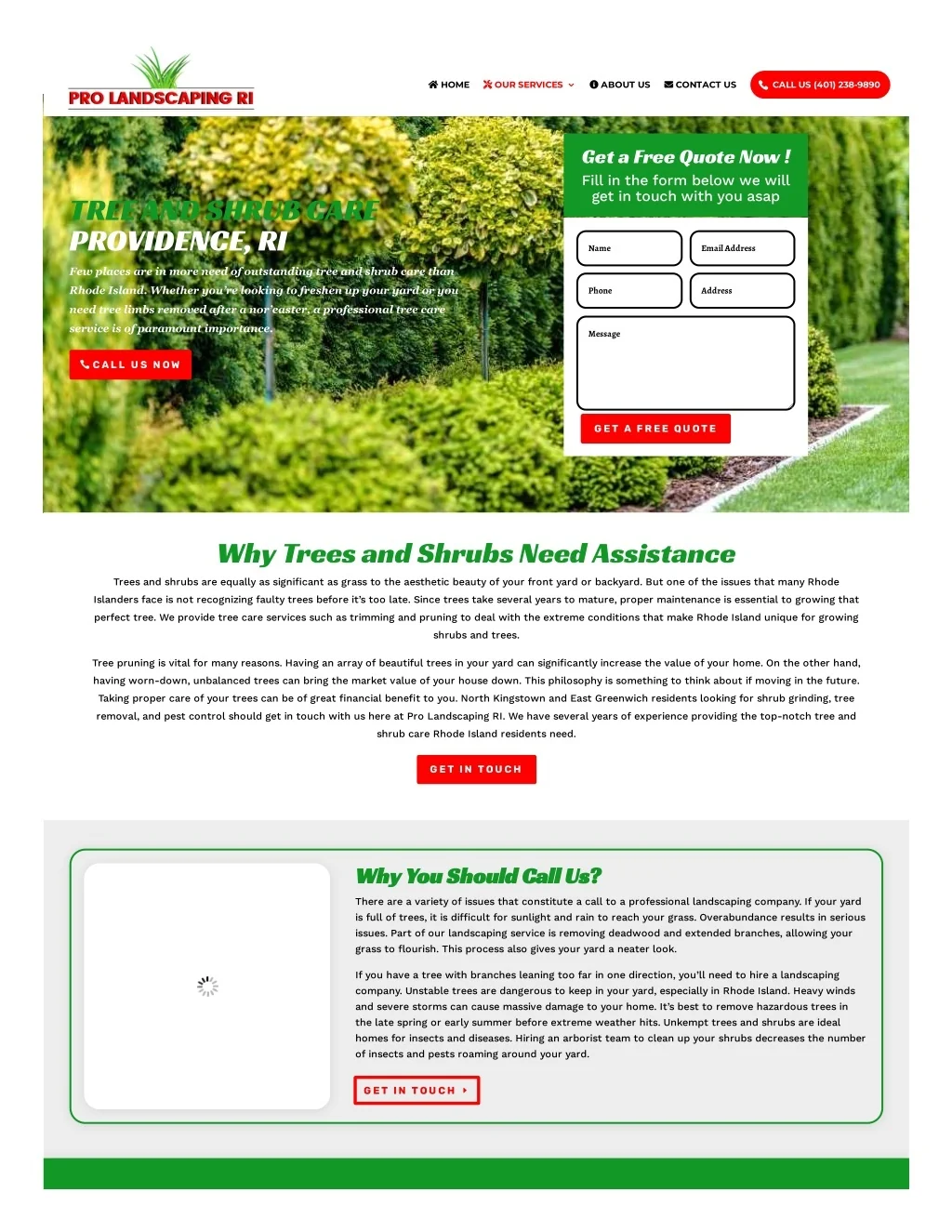 HOME OUR SERVICES3 ABOUT US CONTACT US CALL US (401) 238-9890 Get a Free Quote Now ! Fill in the form below we will get in touch with you asap TREE AND SHRUB CARE PROVIDENCE, RI Name EmailAddress Few places are in more need of outstanding tree and shrub care than Rhode Island. Whether you’re looking to freshen up your yard or you Phone Address need tree limbs removed after a nor’easter, a professional tree care service is of paramount importance. Message CAL L U S N OW G ET A FREE QU OTE Why Trees and Shrubs Need Assistance Trees and shrubs are equally as signi?cant as grass to the aesthetic beauty of your front yard or backyard. But one of the issues that many Rhode Islanders face is not recognizing faulty trees before it’s too late. Since trees take several years to mature, proper maintenance is essential to growing that perfect tree. We provide tree care services such as trimming and pruning to deal with the extreme conditions that make Rhode Island unique for growing shrubs and trees. Tree pruning is vital for many reasons. Having an array of beautiful trees in your yard can signi?cantly increase the value of your home. On the other hand, having worn-down, unbalanced trees can bring the market value of your house down. This philosophy is something to think about if moving in the future. Taking proper care of your trees can be of great ?nancial bene?t to you. North Kingstown and East Greenwich residents looking for shrub grinding, tree removal, and pest control should get in touch with us here at Pro Landscaping RI. We have several years of experience providing the top-notch tree and shrub care Rhode Island residents need. G ET IN TOU CH Why You Should Call Us? There are a variety of issues that constitute a call to a professional landscaping company. If your yard is full of trees, it is di?cult for sunlight and rain to reach your grass. Overabundance results in serious issues. Part of our landscaping service is removing deadwood and extended branches, allowing your grass to ?ourish. This process also gives your yard a neater look. If you have a tree with branches leaning too far in one direction, you’ll need to hire a landscaping company. Unstable trees are dangerous to keep in your yard, especially in Rhode Island. Heavy winds and severe storms can cause massive damage to your home. It’s best to remove hazardous trees in the late spring or early summer before extreme weather hits. Unkempt trees and shrubs are ideal homes for insects and diseases. Hiring an arborist team to clean up your shrubs decreases the number of insects and pests roaming around your yard. G ET IN TOU CH E