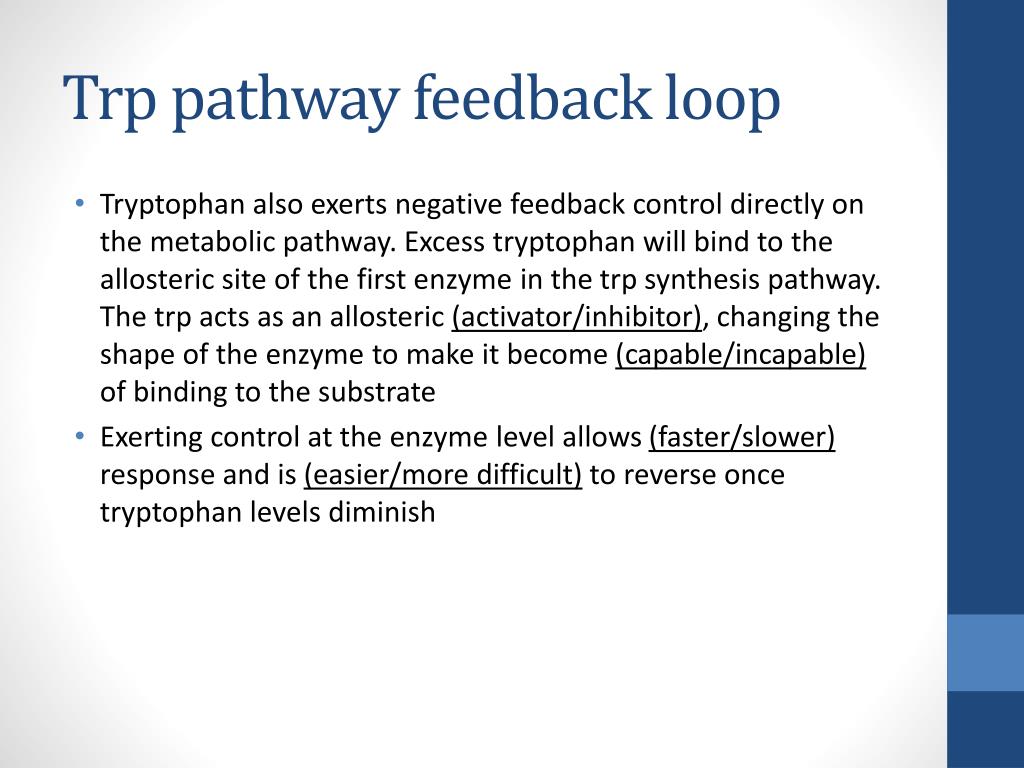 Trp pathway feedback loop • Tryptophan also exerts negative feedback control directly on the metabolic pathway. Excess tryptophan will bind to the allosteric site of the first enzyme in the trp synthesis pathway. The trp acts as an allosteric (activator/inhibitor), changing the shape of the enzyme to make it become (capable/incapable) of binding to the substrate • Exerting control at the enzyme level allows (faster/slower)response and is (easier/more difficult)to reverse once tryptophan levels diminish