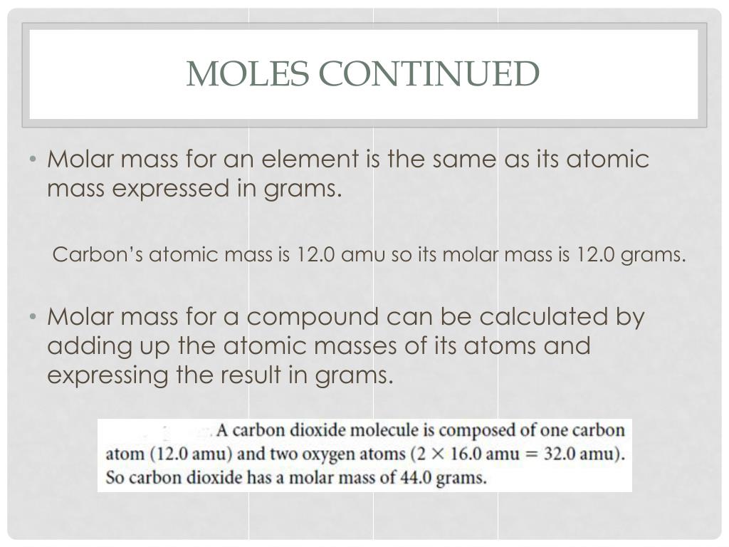 Moles Continued • Molar mass for an element is the same as its atomic mass expressed in grams. Carbon’s atomic mass is 12.0 amu so its molar mass is 12.0 grams. • Molar mass for a compound can be calculated by adding up the atomic masses of its atoms and expressing the result in grams.