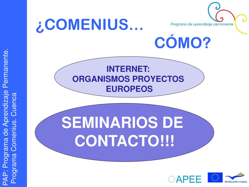 ¿COMENIUS… CÓMO? Asss R R r INTERNET: ORGANISMOS PROYECTOS EUROPEOS SEMINARIOS DE CONTACTO!!!