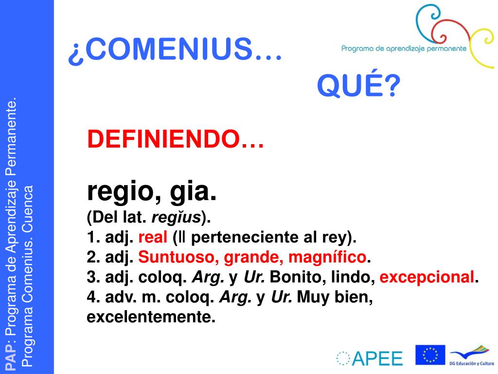 ¿COMENIUS… QUÉ? Asss R R r DEFINIENDO… regio, gia. (Del lat. regĭus). 1. adj. real (‖ perteneciente al rey). 2. adj. Suntuoso, grande, magnífico. 3. adj. coloq. Arg. y Ur. Bonito, lindo, excepcional. 4. adv. m. coloq. Arg. y Ur. Muy bien, excelentemente.
