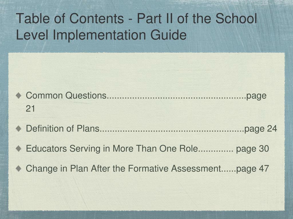 Table of Contents - Part II of the School Level Implementation Guide • Common Questions.......................................................page 21 • Definition of Plans.........................................................page 24 • Educators Serving in More Than One Role.............. page 30 • Change in Plan After the Formative Assessment......page 47