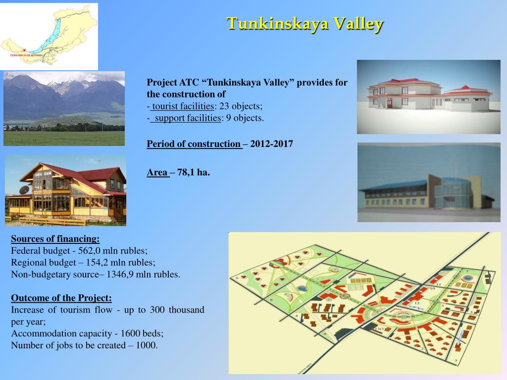 Tunkinskaya Valley • Project ATC“Tunkinskaya Valley” provides for the construction of • tourist facilities: 23 objects; • support facilities: 9 objects. • Period of construction– 2012-2017 • Area– 78,1ha. Sources of financing: Federal budget - 562,0 mlnrubles; Regional budget – 154,2 mln rubles; Non-budgetarysource– 1346,9 mln rubles. Outcome of the Project: Increase of tourism flow - upto 300 thousandper year; Accommodation capacity - 1600 beds; Number of jobs to be created – 1000.