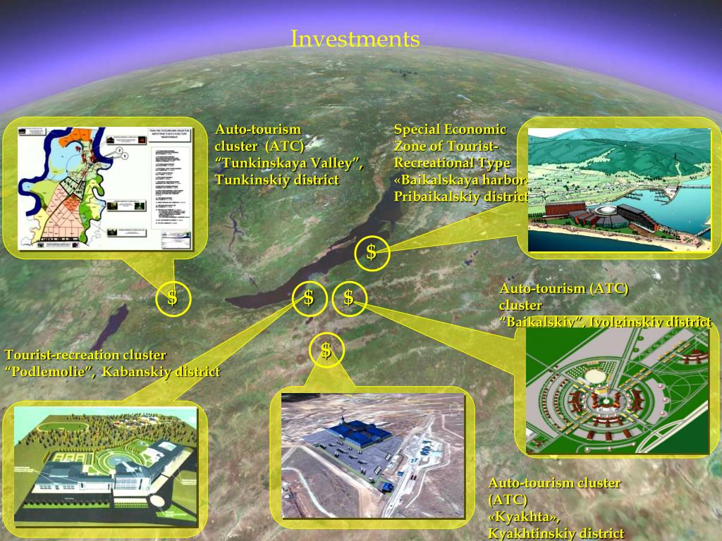 Auto-tourism cluster (ATC) “Tunkinskaya Valley”, Tunkinskiy district Special Economic Zone of Tourist- Recreational Type «Baikalskaya harbor», Pribaikalskiy district $ Auto-tourism(ATC) cluster “Baikalskiy”, Ivolginskiy district $ $ $ $ Tourist-recreation cluster “Podlemolie”, Kabanskiy district Auto-tourism cluster(ATC) «Kyakhta», Kyakhtinskiy district Investments