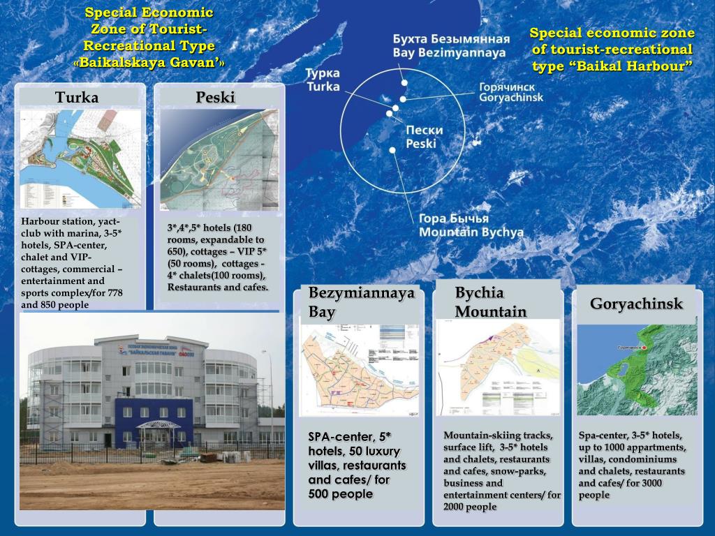 Special Economic Zone of Tourist-Recreational Type«Baikalskaya Gavan’» Special economic zone of tourist-recreational type “Baikal Harbour” Turka Peski 3*,4*,5* hotels (180 rooms, expandable to 650), cottages – VIP 5* (50 rooms), cottages - 4* chalets(100 rooms), Restaurants and cafes. Harbour station, yact-club with marina, 3-5* hotels, SPA-center, chalet and VIP-cottages, commercial –entertainment and sports complex/for 778 and 850 people Bezymiannaya Bay Bychia Mountain Goryachinsk SPA-center, 5* hotels, 50 luxury villas, restaurants and cafes/ for 500 people Mountain-skiing tracks, surface lift, 3-5* hotels and chalets, restaurants and cafes, snow-parks, business and entertainment centers/ for 2000 people Spa-center, 3-5* hotels, up to 1000 appartments, villas, condominiums and chalets, restaurants and cafes/ for 3000 people