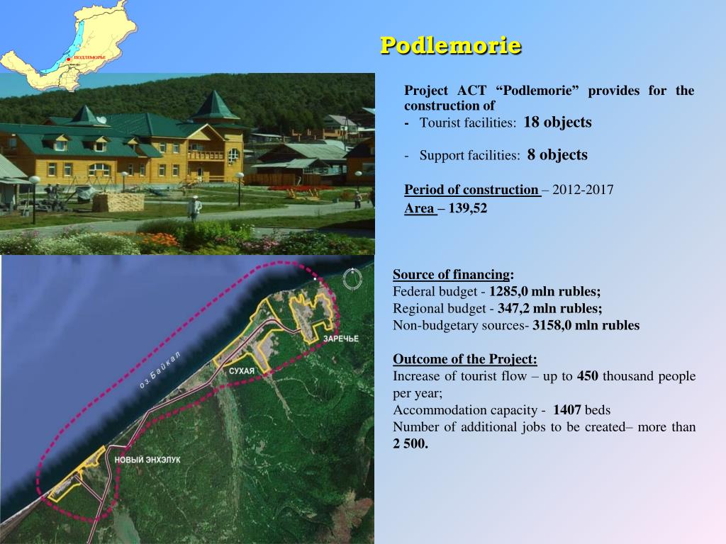 Podlemorie Project ACT “Podlemorie” provides for the construction of - Tourist facilities: 18 objects • Support facilities: 8 objects Period of construction– 2012-2017 Area– 139,52 . Source of financing: Federal budget - 1285,0 mlnrubles; Regional budget - 347,2 mln rubles; Non-budgetary sources- 3158,0 mlnrubles Outcome of the Project: Increase of tourist flow – up to450 thousand people per year; Accommodation capacity - 1407beds Number of additional jobs to be created– more than2 500.