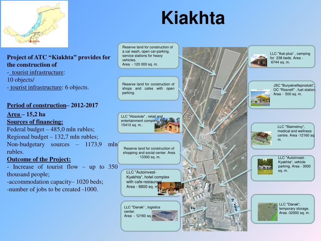 Kiakhta Reserve land for construction of a car wash, open car-parking, service stations for heavy vehicles. Area - 120 000 sq. m. LLC "Ikat-plus“ , camping for 238 beds. Area - 6744 sq. m. • Project of ATC“Kiakhta” provides for the construction of • tourist infrastructure: • 10 objects/ • tourist infrastructure: 6 objects. • Period of construction– 2012-2017 • Area– 15,2ha • Sources of financing: • Federal budget – 485,0 mln rubles; • Regional budget – 132,7 mlnrubles; • Non-budgetary sources – 1173,9 mln rubles. • Outcome of the Project: • - Increase of tourist flow – up to 350 thousand people; • -accommodation capacity– 1020 beds; • -number of jobs to be created -1000. Reserve land for construction of shops and cafes with open parking. JSC "Buryatnefteprodukt“, OC "Rosneft" , fuel station. Area - 500 sq. m. LLC "Absolute“ , retail and entertainment complex. Area -15410 sq. m.. LLC "Stamstroy“, medical and wellness centre. Area -12160 sq. m. Reserve land for construction of shopping and social center. Area - 13300 sq. m. LLC "Autoinvest-Kyakhta“, vehicle parking. Area - 3000 sq. m. LLC "Autoinvest-Kyakhta“, hotel complex with cafe-restaurant . Area - 9800 sq. m. LLC "Danak“, temporary storage. Area -32000 sq. m. LLC "Danak“ , logistics center. Area - 12160 sq. m.