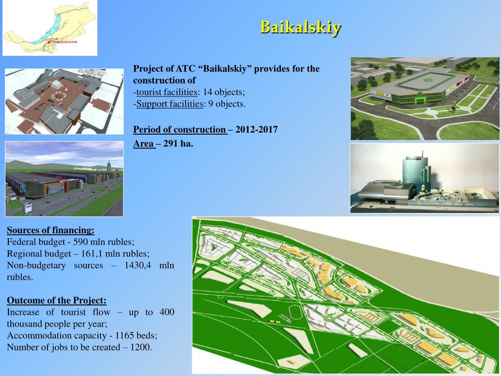 Baikalskiy • Project of ATC“Baikalskiy” provides for the construction of • tourist facilities: 14 objects; • Support facilities: 9 objects. • Period of construction– 2012-2017 • Area – 291 ha. Sources of financing: Federal budget - 590 mlnrubles; Regional budget – 161,1 mln rubles; Non-budgetary sources – 1430,4 mlnrubles. Outcome of the Project: Increase of tourist flow – up to 400 thousandpeople per year; Accommodation capacity - 1165 beds; Number of jobs to be created – 1200.