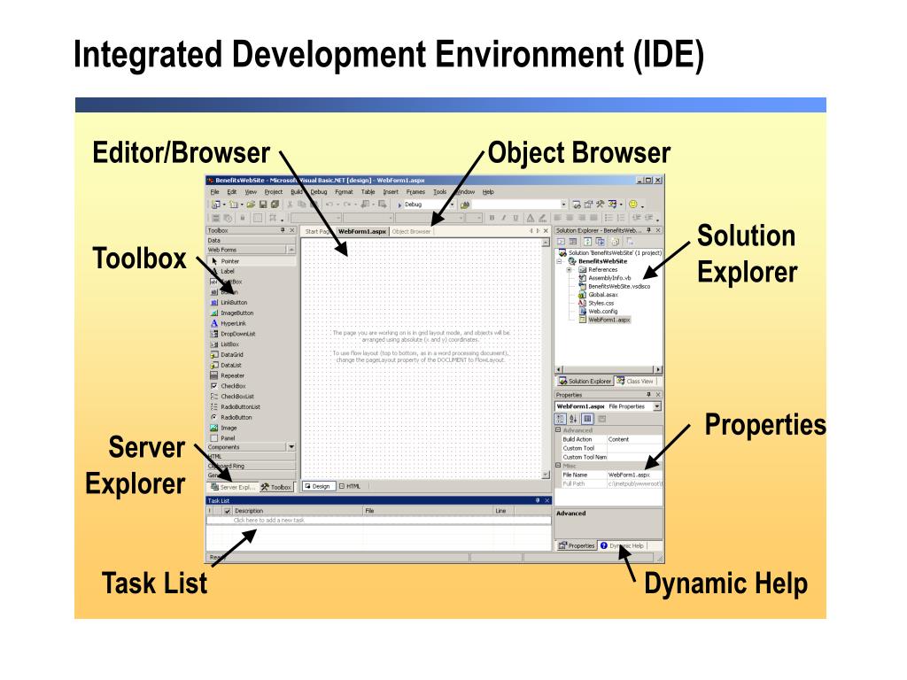 Integrated Development Environment (IDE) Editor/Browser Object Browser SolutionExplorer Toolbox Properties ServerExplorer Task List Dynamic Help
