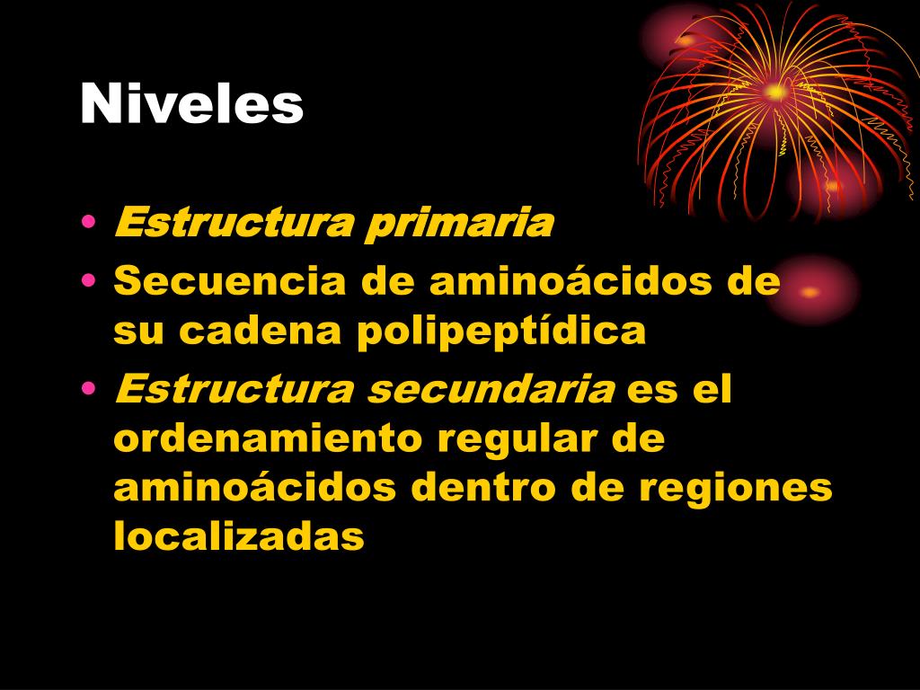 Niveles • Estructura primaria • Secuencia de aminoácidos de su cadena polipeptídica • Estructura secundaria es el ordenamiento regular de aminoácidos dentro de regiones localizadas