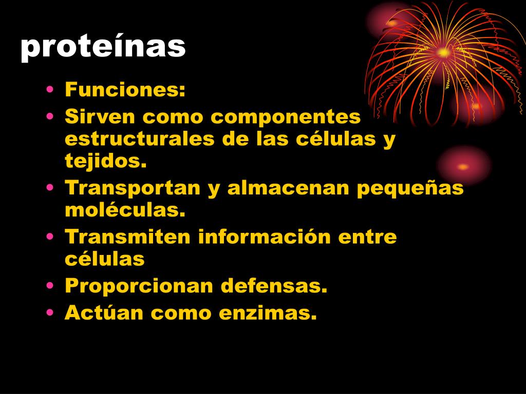proteínas • Funciones: • Sirven como componentes estructurales de las células y tejidos. • Transportan y almacenan pequeñas moléculas. • Transmiten información entre células • Proporcionan defensas. • Actúan como enzimas.