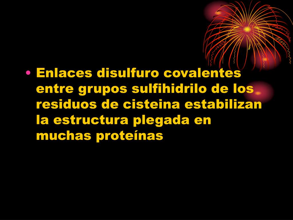Enlaces disulfuro covalentes entre grupos sulfihidrilo de los residuos de cisteina estabilizan la estructura plegada en muchas proteínas