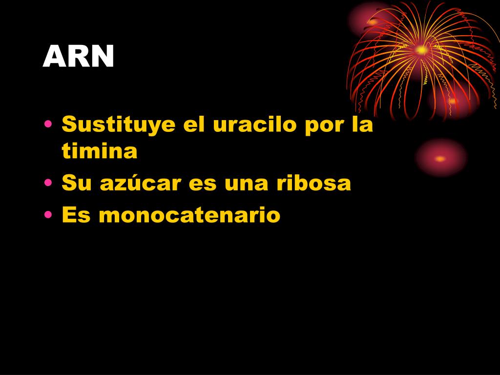 ARN • Sustituye el uracilo por la timina • Su azúcar es una ribosa • Es monocatenario