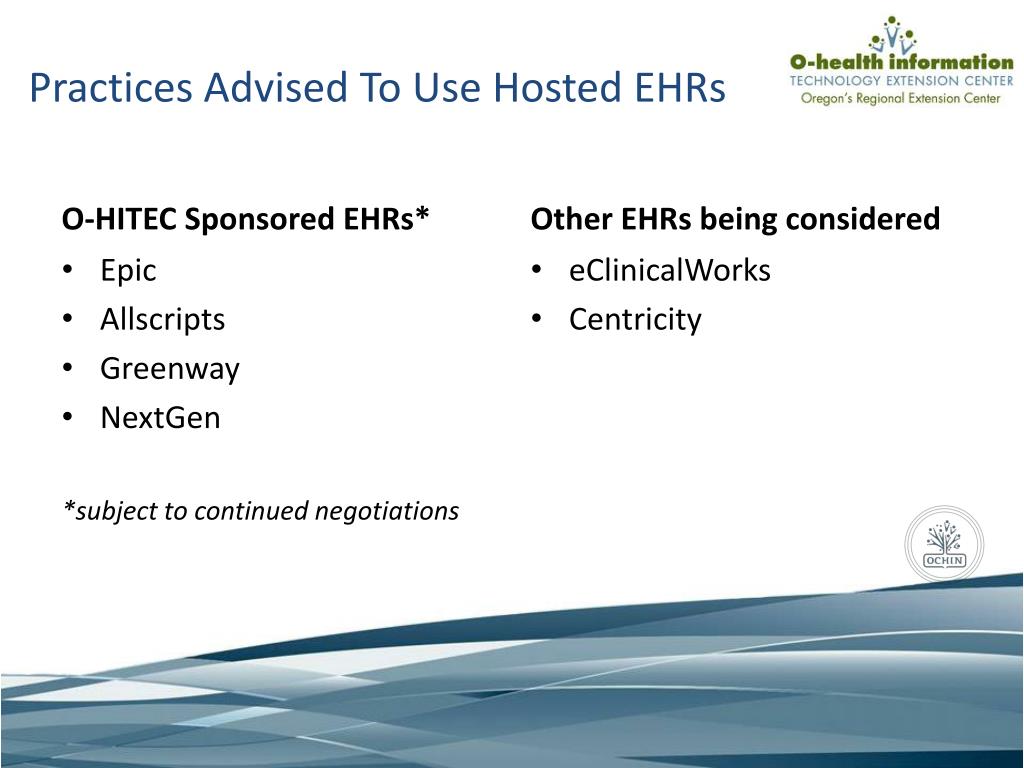 Practices Advised To Use Hosted EHRs O-HITEC Sponsored EHRs* Other EHRs being considered eClinicalWorks Centricity • Epic • Allscripts • Greenway • NextGen *subject to continued negotiations