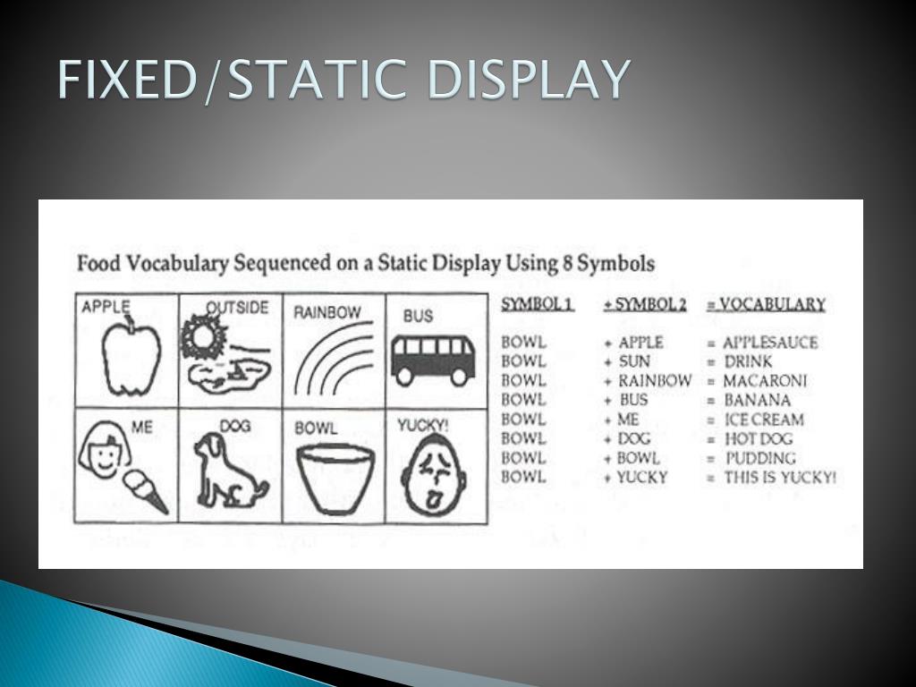 Moving Through the Symbol Hierarchy • Increase number of symbols in vocabulary • Increase size of symbol array presented • Provide opportunities for generalization to other contexts • Encourage student to use symbols fordifferent communicative functions (e.g. labeling, requesting, commenting) • Teach multi-symbolic utterances • Make symbols smaller, more portable to transition to 2-dimensional symbols