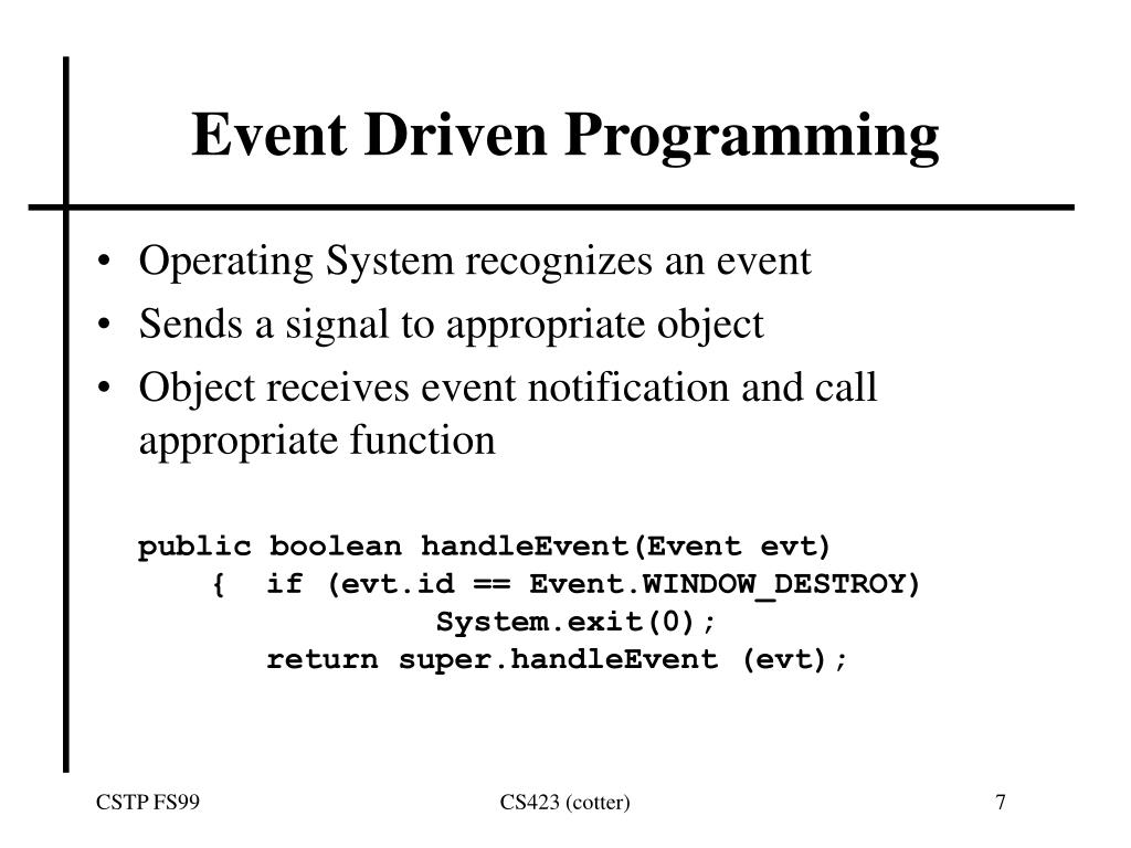 Event Driven Programming • Operating System recognizes an event • Sends a signal to appropriate object • Object receives event notification and call appropriate function public boolean handleEvent(Event evt) { if (evt.id == Event.WINDOW_DESTROY) System.exit(0); return super.handleEvent (evt); CS423 (cotter)