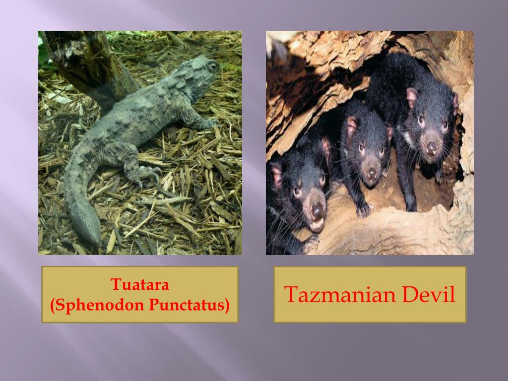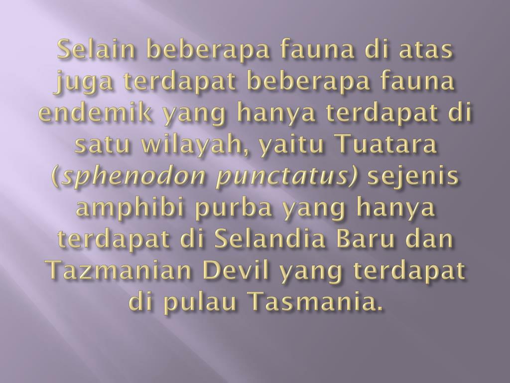 Selain beberapa fauna di atas juga terdapat beberapa fauna endemik yang hanya terdapat di satu wilayah, yaitu Tuatara (sphenodon punctatus) sejenis amphibi purba yang hanya terdapat di Selandia Baru dan Tazmanian Devil yang terdapat di pulau Tasmania.
