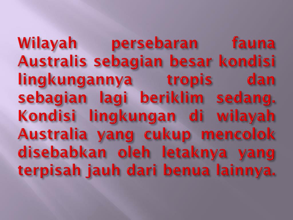 Wilayah persebaran fauna Australis sebagian besar kondisi lingkungannya tropis dan sebagian lagi beriklim sedang. Kondisi lingkungan di wilayah Australia yang cukup mencolok disebabkan oleh letaknya yang terpisah jauh dari benua lainnya.
