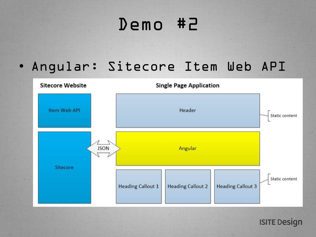 Three Demos • Angular Standalone • Angular + Sitecore Item Web API • Angular Integrated in Sitecore