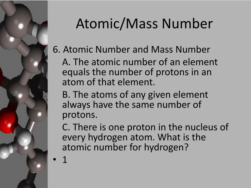 Atomic/Mass Number 6. Atomic Number and Mass Number A. The atomic number of an element equals the number of protons in an atom of that element. B. The atoms of any given element always have the same number of protons. C. There is one proton in the nucleus of every hydrogen atom. What is the atomic number for hydrogen? • 1