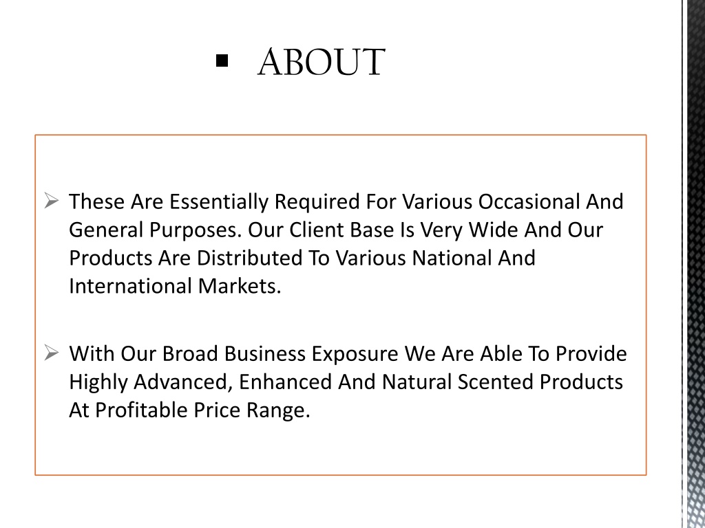 These Are Essentially Required For Various Occasional And General Purposes. Our Client Base Is Very Wide And Our Products Are Distributed To Various National And International Markets. • With Our Broad Business Exposure We Are Able To Provide Highly Advanced, Enhanced And Natural Scented Products At Profitable Price Range. ABOUT
