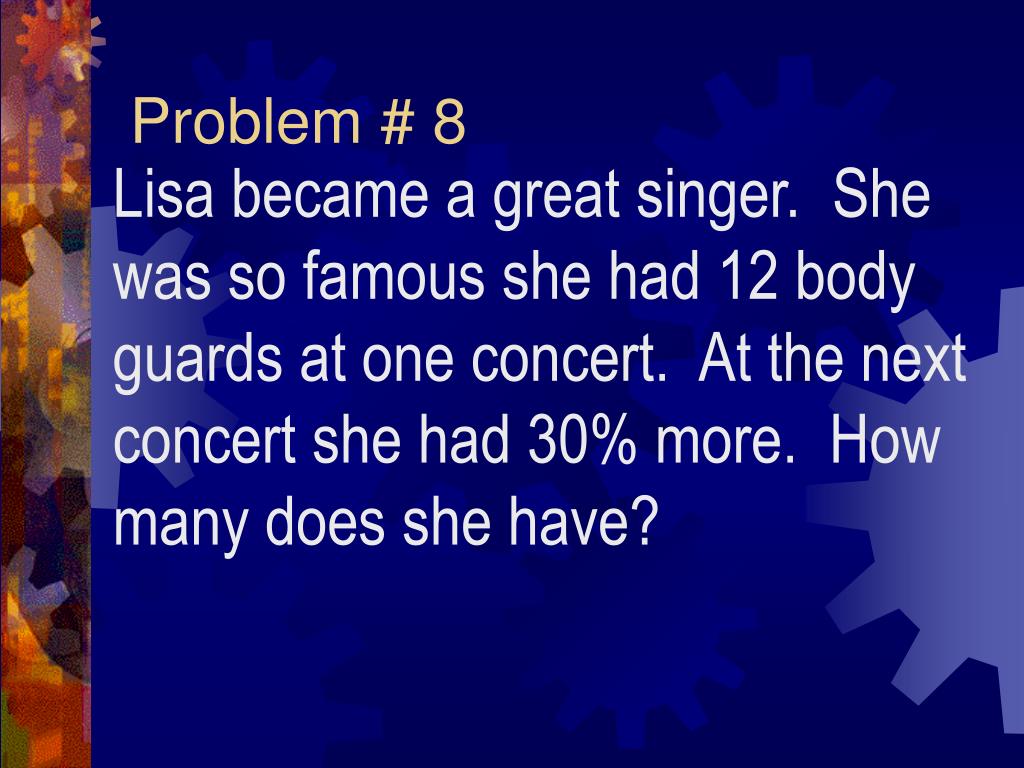 Problem # 8 Lisa became a great singer. She was so famous she had 12 body guards at one concert. At the next concert she had 30% more. How many does she have?