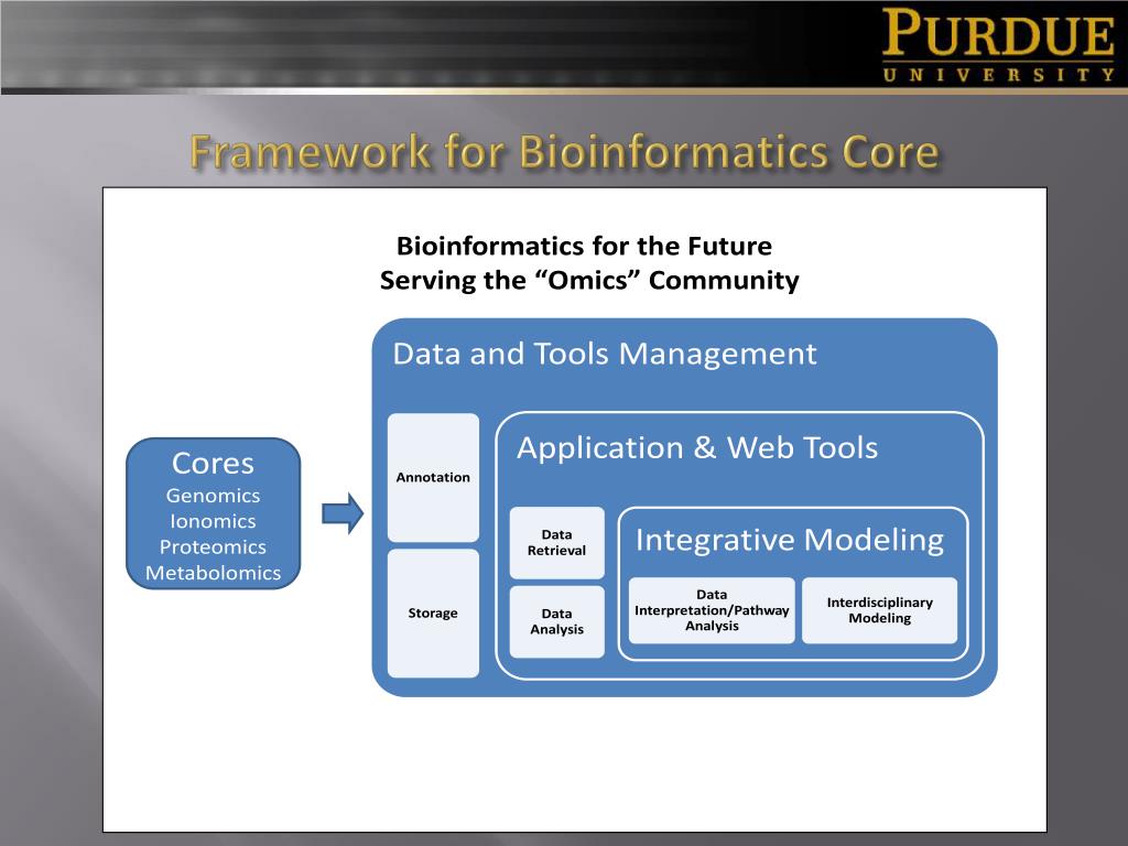 The Goal • Enable Purdue researchers to leverage Bioinformatics Resources to Accelerate, Amplify, and Facilitate Biological Research and Discovery through • Consultation and advice • Quality Analysis services • Training • workshops/seminars • Maintain hardware and software