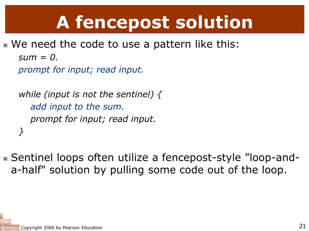 A fencepost solution • We need the code to use a pattern like this: sum = 0. prompt for input; read input. while (input is not the sentinel) { add input to the sum. prompt for input; read input. } • Sentinel loops often utilize a fencepost-style "loop-and-a-half" solution by pulling some code out of the loop.